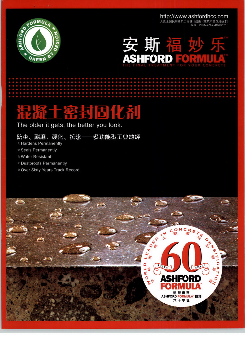 ASHFORD FORMULA- 安斯福妙樂®--世界混凝土密封固化劑的最早發(fā)明者;美國、加拿大行業(yè)標準的制定者;迄今全球業(yè)績逾四十億平方英尺,全球首個二十年質(zhì)保地坪;最早經(jīng)施工A/F的地坪使用已逾六十年,而且狀態(tài)良好,真正實現(xiàn)一勞永逸!